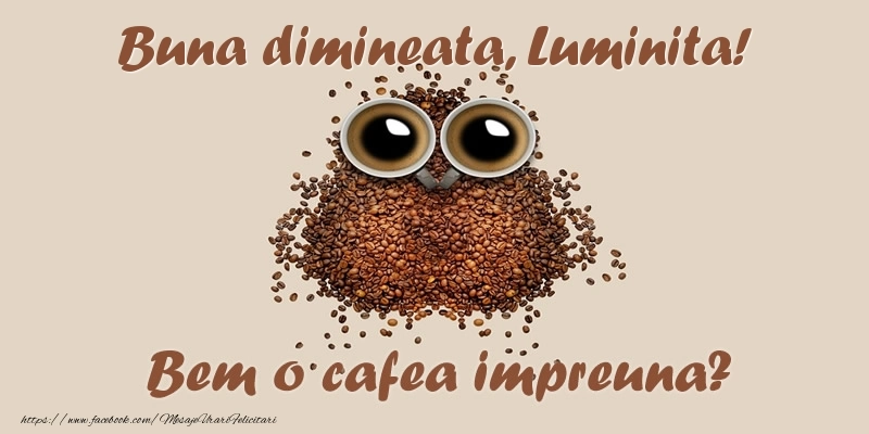 Această felicitare cu aranjament cu cafea amuzant din colecția noastră de felicitari de buna dimineata cu numele Luminita are o notă de originalitate și îți oferă ocazia să faci o persoană să se simtă specială datorită faptului că acolo este numele ei. Felicitarea se poate descărca gratuit sau se poate trimite prin Whatsapp, Facebook, Twitter, Pinterest. Imagine de bună dimineața cu aranjament cu cafea amuzant cu dimensiunile 800px x 400px și cu textul Buna dimineata, Luminita! Bem o cafea impreuna?.