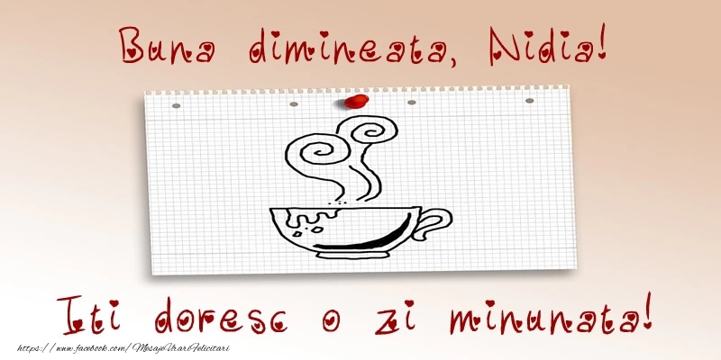 Felicitarea de buna dimineata cu cafea de dragoste cu inimioare pentru Nidia aduce cu sine raze luminoase și culori calde, ca o invitație la un nou început plin de bucurie. În această dimineață, aroma cafelei se amestecă cu numele Nidia pentru a crea un amestec unic de energie și confort.