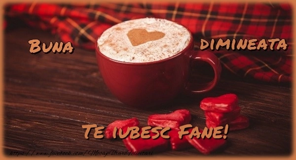 Această felicitare cu cafea cu inimioară din colecția noastră de felicitari de buna dimineata cu numele Fane are o notă de originalitate și îți oferă ocazia să faci o persoană să se simtă specială datorită faptului că acolo este numele ei. Felicitarea se poate descărca gratuit sau se poate trimite prin Whatsapp, Facebook, Twitter, Pinterest. Imagine de bună dimineața cu cafea cu inimioară cu dimensiunile 600px x 324px și cu textul Buna dimineata, te iubesc Fane.