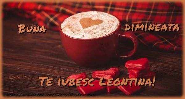 Această felicitare cu cafea cu inimioară din colecția noastră de felicitari de buna dimineata cu numele Leontina are o notă de originalitate și îți oferă ocazia să faci o persoană să se simtă specială datorită faptului că acolo este numele ei. Felicitarea se poate descărca gratuit sau se poate trimite prin Whatsapp, Facebook, Twitter, Pinterest. Imagine de bună dimineața cu cafea cu inimioară cu dimensiunile 600px x 324px și cu textul Buna dimineata, te iubesc Leontina.