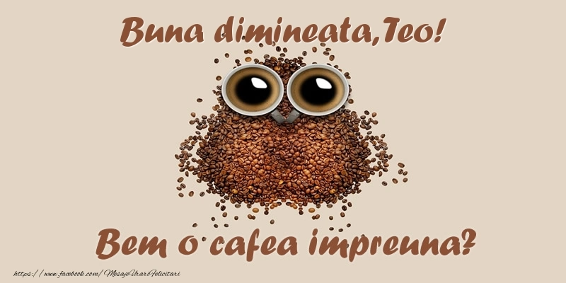 Felicitarea de buna dimineata cu aranjament cu cafea amuzant pentru Teo aduce cu sine raze luminoase și culori calde, ca o invitație la un nou început plin de bucurie. În această dimineață, aroma cafelei se amestecă cu numele Teo pentru a crea un amestec unic de energie și confort.