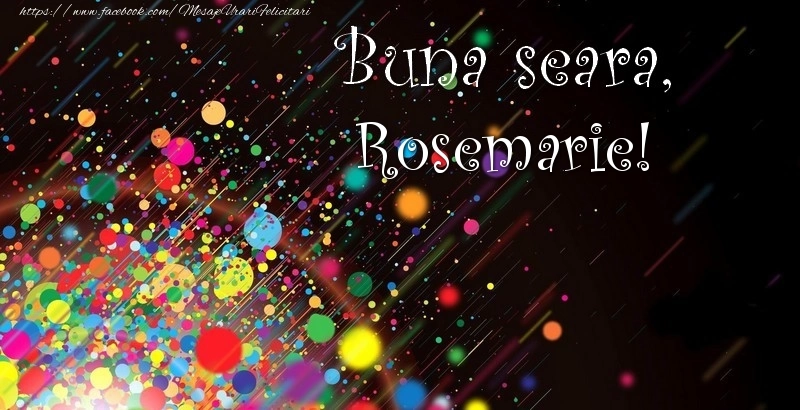 Această felicitare cu confetti din colecția noastră de felicitari de buna seara cu numele Rosemarie are o notă de originalitate și îți oferă ocazia să faci o persoană să se simtă specială datorită faptului că acolo este numele ei. Felicitarea se poate descărca gratuit sau se poate trimite prin Whatsapp, Facebook, Twitter, Pinterest. Imagine de bună seara cu confetti cu dimensiunile 800px x 410px și cu textul Buna seara, Rosemarie!.