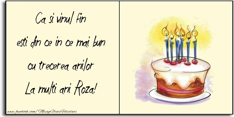 Această felicitare cu tort și urare amuzantă din colecția noastră de felicitari de zi de nastere cu numele Roza are o notă de originalitate și îți oferă ocazia să faci o persoană să se simtă specială datorită faptului că acolo este numele ei. Felicitarea se poate descărca gratuit sau se poate trimite prin Whatsapp, Facebook, Twitter, Pinterest. Imagine de zi de nastere cu tort și urare amuzantă cu dimensiunile 800px x 400px și cu textul Ca si vinul fin esti din ce in ce mai bun cu trecerea anilor Roza.