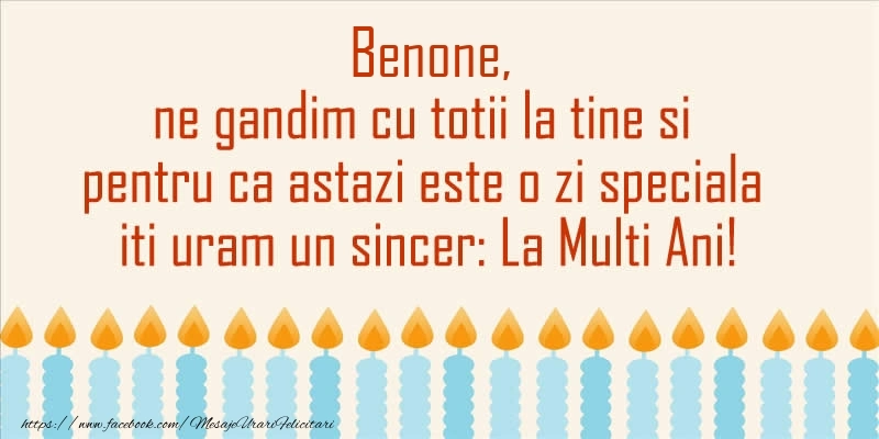 Trimite si tu un gand frumos intr-o felicitare de ziua numelui tuturor care porta numele de Benone. Numele de baiat Benone este unic, iar felicitările noastre reflectă această unicitate. Cu atenție la detalii, fiecare felicitare sărbătorește personalitatea specifică a numelui. Felicitările de Ziua Numelui cu numele Benone pot fi ușor distribuite online pe rețelele sociale pentru a transmite rapid urările voastre sau pot fi tipărite pentru a fi un cadou tangibil și memorabil.