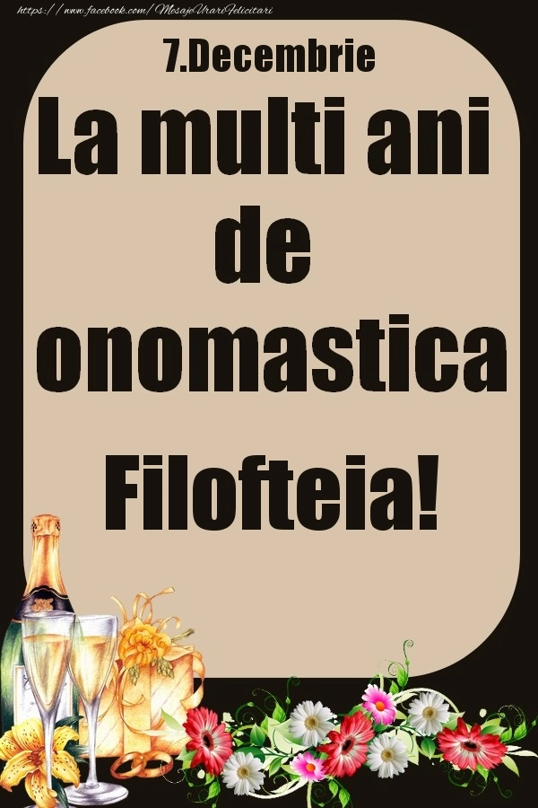 Sărbătorește Ziua Numelui a cuiva drag cu numele Filofteia (7 Decembrie - Sfânta Muceniţă Filofteia) cu imagini și felicitări pline de emoție! Alege o urare deosebită și transmite gânduri bune celor care își celebrează onomastica.