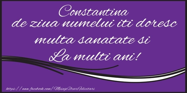 Felicitarea cu mesaj pe fundal mov de Ziua Numelui este un cadou gândit special pentru sărbătoare numelui Constantina. Numele Constantina devine piesa centrală a acestui dar unic, aducând sărbătoriților un strop de bucurie în aceată zi specială.