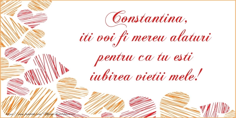 Această felicitare cu desen cu inimioare pe fundal alb din colecția noastră de felicitari de dragoste cu numele Constantina are o notă de originalitate și îți oferă ocazia să faci o persoană să se simtă specială datorită faptului că acolo este numele ei. Felicitarea se poate descărca gratuit sau se poate trimite prin Whatsapp, Facebook, Twitter, Pinterest. Imagine de iubire cu desen cu inimioare pe fundal alb cu dimensiunile 800px x 400px și cu textul Constantina, iti voi fi mereu alaturi pentru ca tu esti iubirea vietii mele!.