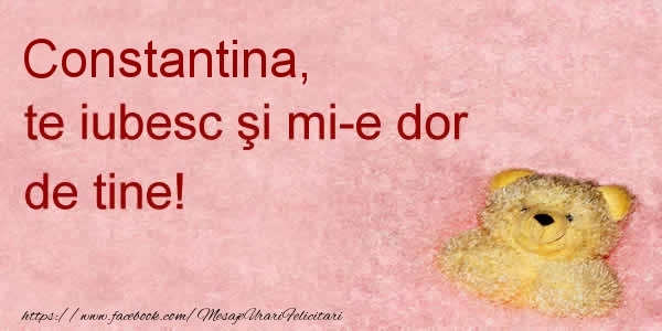 Această felicitare cu ursuleț pentru femei sau bărbați din colecția noastră de felicitari de dragoste cu numele Constantina are o notă de originalitate și îți oferă ocazia să faci o persoană să se simtă specială datorită faptului că acolo este numele ei. Felicitarea se poate descărca gratuit sau se poate trimite prin Whatsapp, Facebook, Twitter, Pinterest. Imagine de iubire cu ursuleț pentru femei sau bărbați cu dimensiunile 600px x 300px și cu textul Constantina te iubesc si mi-e dor de tine! .
