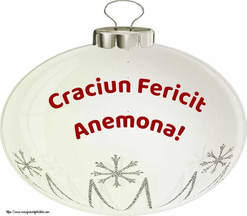 Această felicitare cu glob alb din colecția noastră de felicitari de Craciun cu numele Anemona are o notă de originalitate și îți oferă ocazia să faci o persoană să se simtă specială datorită faptului că acolo este numele ei. Felicitarea se poate descărca gratuit sau se poate trimite prin Whatsapp, Facebook, Twitter, Pinterest. Imagine de Sărbătoarea Crăciunului cu glob alb cu dimensiunile 800px x 700px și cu textul Craciun Fericit Anemona!.