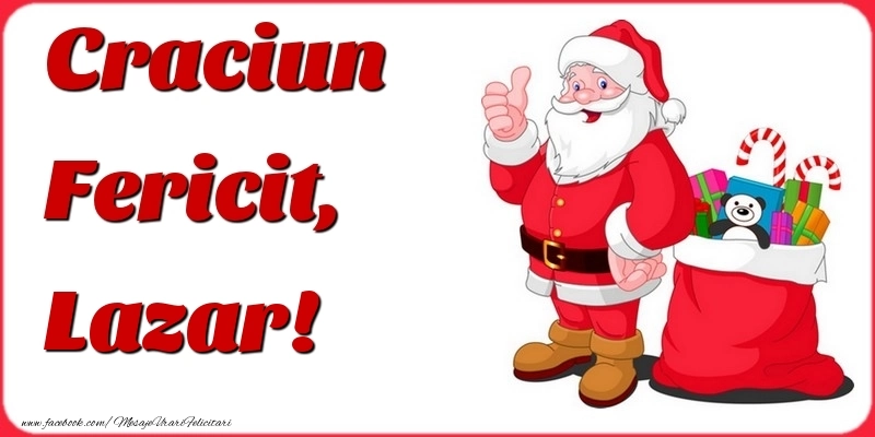 Această felicitare cu fundal cu moș crăciun și sacul de cadouri din colecția noastră de felicitari de Craciun cu numele Lazar are o notă de originalitate și îți oferă ocazia să faci o persoană să se simtă specială datorită faptului că acolo este numele ei. Felicitarea se poate descărca gratuit sau se poate trimite prin Whatsapp, Facebook, Twitter, Pinterest. Imagine de Sărbătoarea Crăciunului cu fundal cu moș crăciun și sacul de cadouri cu dimensiunile 800px x 400px și cu textul Craciun Fericit, Lazar.