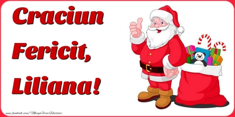 Craciun Fericit, Liliana | Felicitare cu fundal cu moș crăciun și sacul de cadouri | Felicitari de Craciun