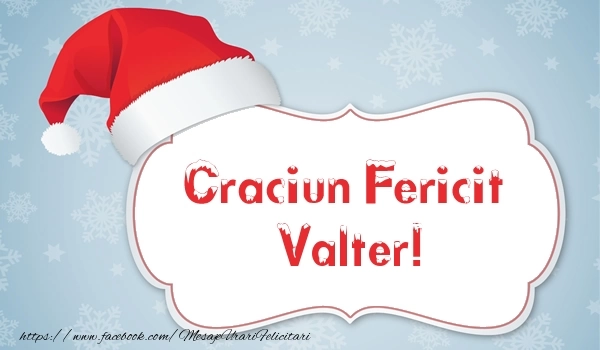 Această felicitare cu șapca lui Mos Craciun din colecția noastră de felicitari de Craciun cu numele Valter are o notă de originalitate și îți oferă ocazia să faci o persoană să se simtă specială datorită faptului că acolo este numele ei. Felicitarea se poate descărca gratuit sau se poate trimite prin Whatsapp, Facebook, Twitter, Pinterest. Imagine de Sărbătoarea Crăciunului cu șapca lui Mos Craciun cu dimensiunile 600px x 350px și cu textul Craciun Fericit Valter!.
