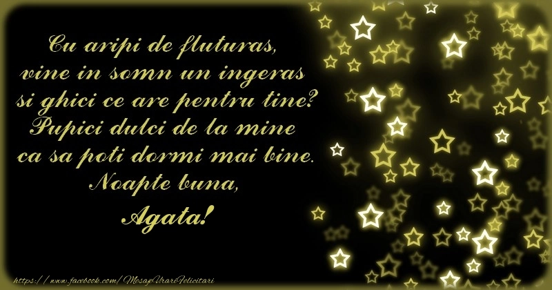 Această felicitare cu stele pe fundal închis din colecția noastră de felicitari de noapte buna cu numele Agata are o notă de originalitate și îți oferă ocazia să faci o persoană să se simtă specială datorită faptului că acolo este numele ei. Felicitarea se poate descărca gratuit sau se poate trimite prin Whatsapp, Facebook, Twitter, Pinterest. Imagine de noapte bună cu stele pe fundal închis cu dimensiunile 800px x 420px și cu textul Cu aripi de fluturas, vine in somn un ingeras si ghici ce are pentru tine? Pupici dulci de la mine ca sa poti dormi mai bine. Noapte buna, Agata!.