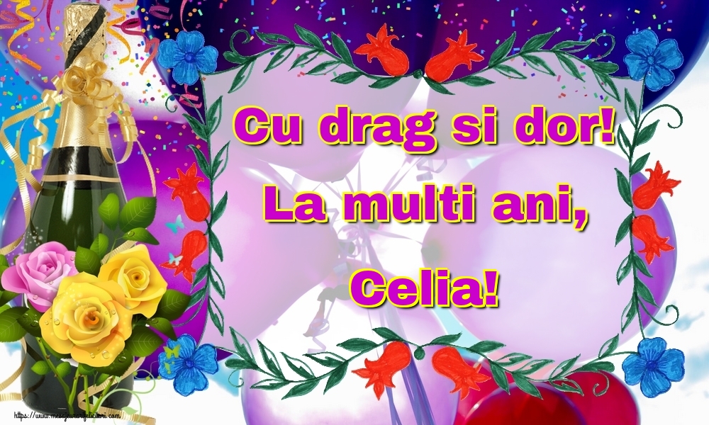 Cu drag si dor! La multi ani, Celia! | Felicitare cu șampanie și aranjament cu trandafiri | Felicitari de la multi ani