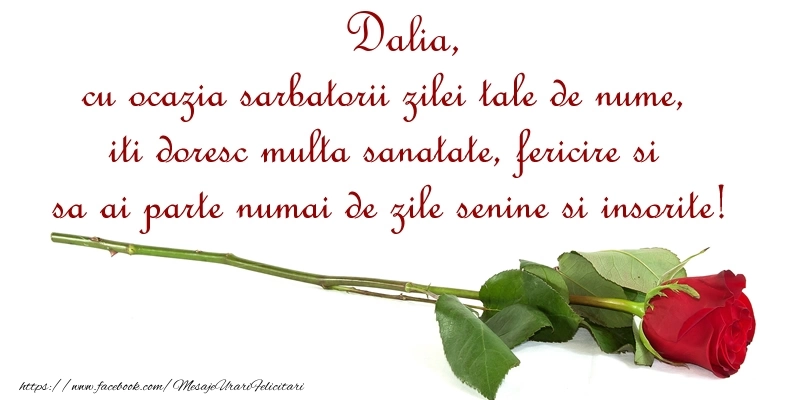 Dalia, cu ocazia sarbatorii zilei tale de nume, iti doresc multa sanatate, fericire si sa ai parte numai de zile senine si insorite!