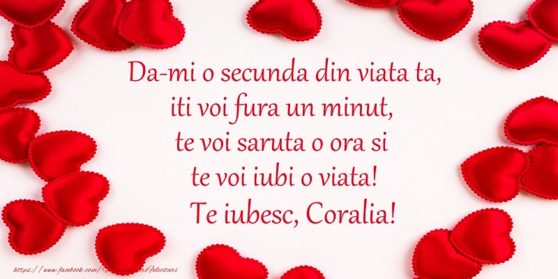 Da-mi o secunda din viata ta, iti voi fura un minut, te voi saruta o ora si te voi iubi o viata! Te iubesc, Coralia! | Felicitare cu chenar cu inimioare | Felicitari de dragoste