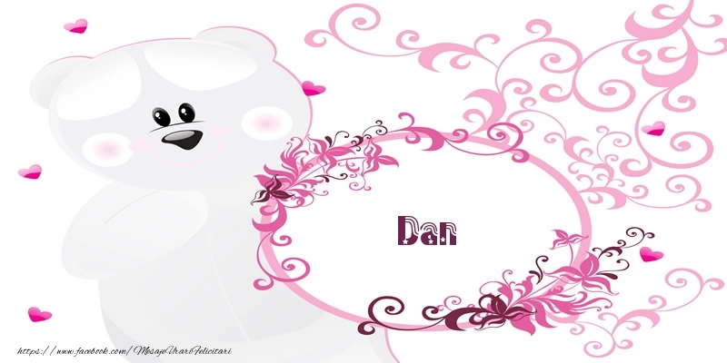 Această felicitare cu ursulet si inimioare din colecția noastră de felicitari de dragoste cu numele Dan are o notă de originalitate și îți oferă ocazia să faci o persoană să se simtă specială datorită faptului că acolo este numele ei. Felicitarea se poate descărca gratuit sau se poate trimite prin Whatsapp, Facebook, Twitter, Pinterest. Imagine de iubire cu ursulet si inimioare cu dimensiunile 800px x 400px și cu textul Dan Te iubesc!.