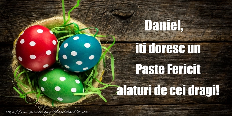 Felicitarea pentru Daniel cu oua colorate in cos pe fundal din lemn este un cadou unic și personal, creat special pentru Paște. Numele Daniel devine inima acestui dar, aducând bucurie și căldură într-un mod special și intim.