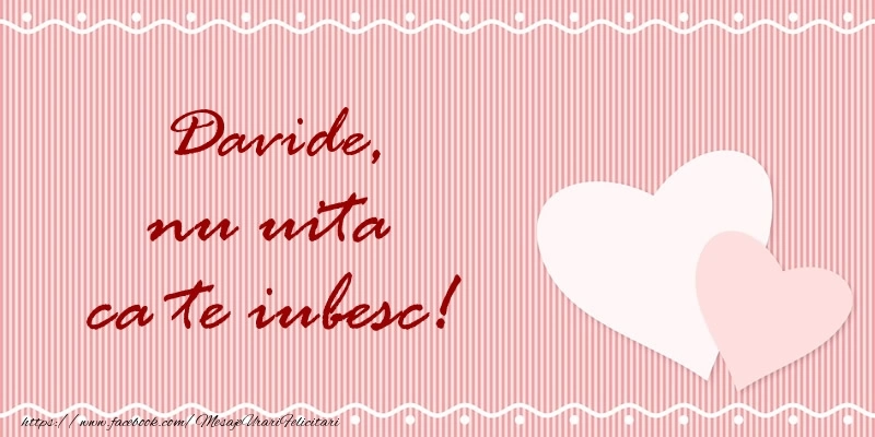 Această felicitare cu inimioare pe fundal roz din colecția noastră de felicitari de dragoste cu numele Davide are o notă de originalitate și îți oferă ocazia să faci o persoană să se simtă specială datorită faptului că acolo este numele ei. Felicitarea se poate descărca gratuit sau se poate trimite prin Whatsapp, Facebook, Twitter, Pinterest. Imagine de iubire cu inimioare pe fundal roz cu dimensiunile 800px x 400px și cu textul Davide nu uita ca te iubesc!.