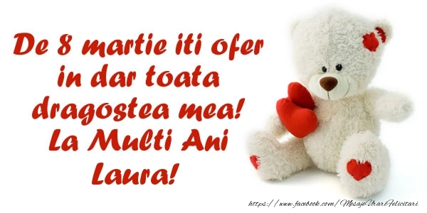 De 8 martie iti ofer in dar toata dragostea mea! La Multi Ani Laura! | Felicitare cu ursuleț alb cu inimioare roșii | Felicitari 8 Martie Ziua Femeii