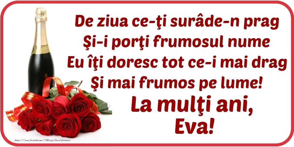 De ziua ce-ţi surâde-n prag / Şi-i porţi frumosul nume / Eu îţi doresc tot ce-i mai drag / Şi mai frumos pe lume! La mulţi ani, Eva! | Felicitare cu trandafiri roșii și șampanie | Felicitari de Ziua Numelui