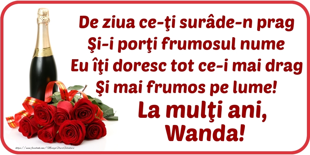 De ziua ce-ţi surâde-n prag / Şi-i porţi frumosul nume / Eu îţi doresc tot ce-i mai drag / Şi mai frumos pe lume! La mulţi ani, Wanda!