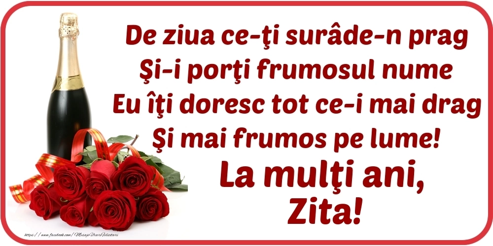 De ziua ce-ţi surâde-n prag / Şi-i porţi frumosul nume / Eu îţi doresc tot ce-i mai drag / Şi mai frumos pe lume! La mulţi ani, Zita! | Felicitare cu trandafiri roșii și șampanie | Felicitari de Ziua Numelui