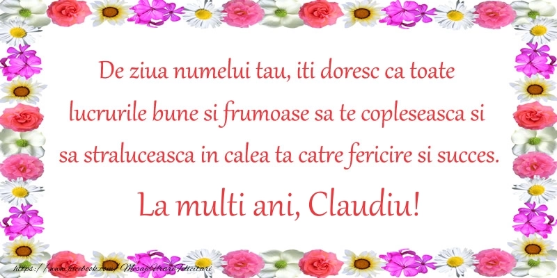 De ziua numelui tau, iti doresc ca toate lucrurile bune si frumoase sa te copleseasca si sa straluceasca in calea ta catre fericire si succes. La Multi Ani Claudiu! | Felicitare cu chenar cu flori | Felicitari de Ziua Numelui