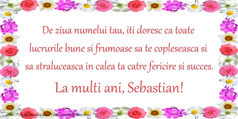 De ziua numelui tau, iti doresc ca toate lucrurile bune si frumoase sa te copleseasca si sa straluceasca in calea ta catre fericire si succes. La Multi Ani Sebastian! | Felicitare cu chenar cu flori | Felicitari de Ziua Numelui