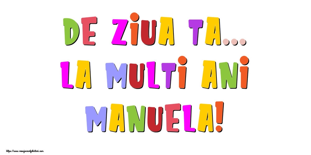 Felicitarea cu litere colorate este ca o explozie de bucurie și culoare, iar numele Manuela este adăugat cu gingășie pentru a personaliza această experiență de sărbătoare. Este modul tău de a spune la mulți ani într-un mod unic și special!