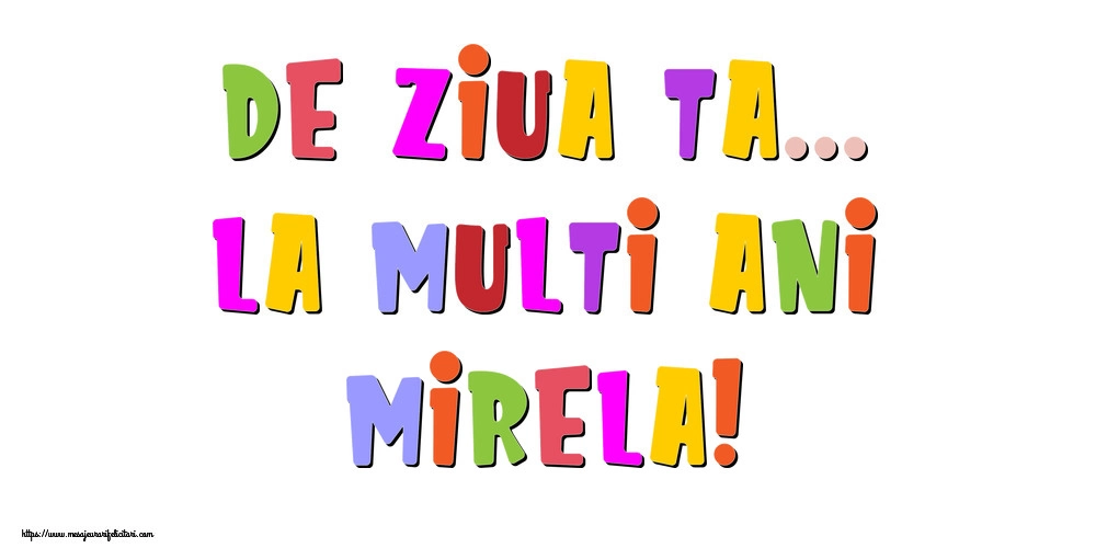 Felicitarea cu litere colorate este ca o explozie de bucurie și culoare, iar numele Mirela este adăugat cu gingășie pentru a personaliza această experiență de sărbătoare. Este modul tău de a spune la mulți ani într-un mod unic și special!