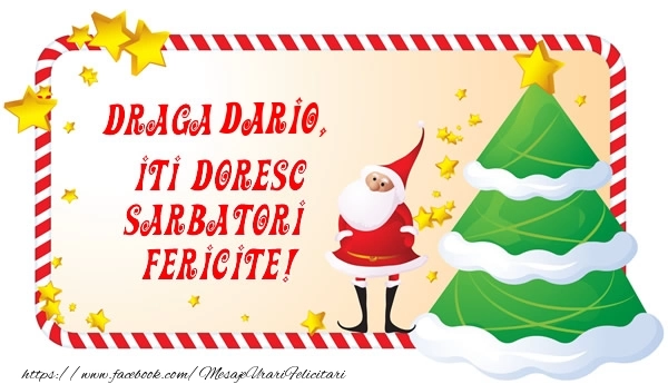 Această felicitare cu Mos Craciun amuzant și desen cu brad și stele din colecția noastră de felicitari de Craciun cu numele Dario are o notă de originalitate și îți oferă ocazia să faci o persoană să se simtă specială datorită faptului că acolo este numele ei. Felicitarea se poate descărca gratuit sau se poate trimite prin Whatsapp, Facebook, Twitter, Pinterest. Imagine de Sărbătoarea Crăciunului cu Mos Craciun amuzant și desen cu brad și stele cu dimensiunile 600px x 345px și cu textul Draga Dario, Iti Doresc Sarbatori Fericite!.