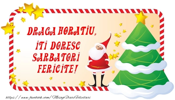 Felicitarea cu Mos Craciun amuzant și desen cu brad și stele pentru Horatiu spune o poveste de iarnă unică, iar numele Horatiu este eroul principal. Este o călătorie captivantă în lumea minunată a Crăciunului, personalizată pentru a aduce bucurie și emoție.