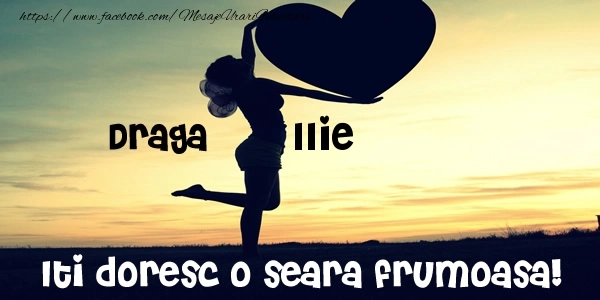 Această felicitare cu o persoană care ține în mână o inimioară la apusul soarelui din colecția noastră de felicitari de buna seara cu numele Ilie are o notă de originalitate și îți oferă ocazia să faci o persoană să se simtă specială datorită faptului că acolo este numele ei. Felicitarea se poate descărca gratuit sau se poate trimite prin Whatsapp, Facebook, Twitter, Pinterest. Imagine de bună seara cu o persoană care ține în mână o inimioară la apusul soarelui cu dimensiunile 600px x 300px și cu textul Draga Ilie Iti doresc o seara frumoasa!.