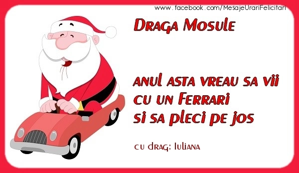 Draga Mosule anul asta vreau sa vii cu un Ferrari si sa pleci pe jos Iuliana | Felicitare cu Mos Craciun haios pe Ferrari | Felicitari de Craciun