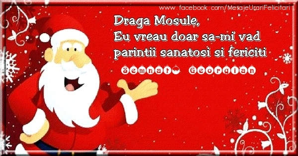 Această felicitare cu scrisoare pentru Mos Craciun de la copii din colecția noastră de felicitari de Craciun cu numele Georgian are o notă de originalitate și îți oferă ocazia să faci o persoană să se simtă specială datorită faptului că acolo este numele ei. Felicitarea se poate descărca gratuit sau se poate trimite prin Whatsapp, Facebook, Twitter, Pinterest. Imagine de Sărbătoarea Crăciunului cu scrisoare pentru Mos Craciun de la copii cu dimensiunile 600px x 315px și cu textul Draga Mosule, eu vreau doar sa-i vad parintii sanatosi si fericiti Semnat: .