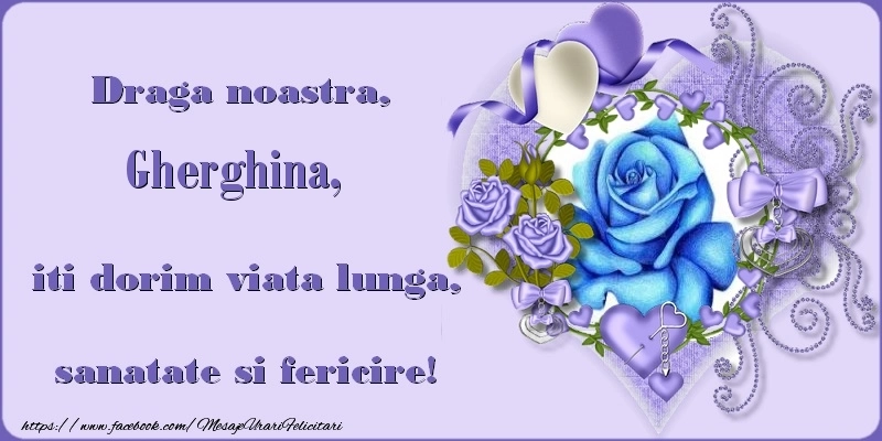 Draga noastra, Gherghina, iti dorim viata lunga, sanatate si fericire! | Felicitare cu aranjament pe mov cu inimioare și trandafiri | Felicitari de zi de nastere