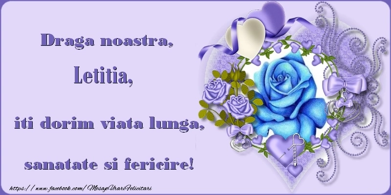 Draga noastra, Letitia, iti dorim viata lunga, sanatate si fericire! | Felicitare cu aranjament pe mov cu inimioare și trandafiri | Felicitari de zi de nastere
