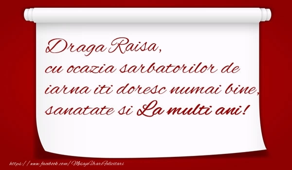 Draga Raisa, cu ocazia sarbatorilor de iarna iti doresc numai bine, sanatate si La multi ani!