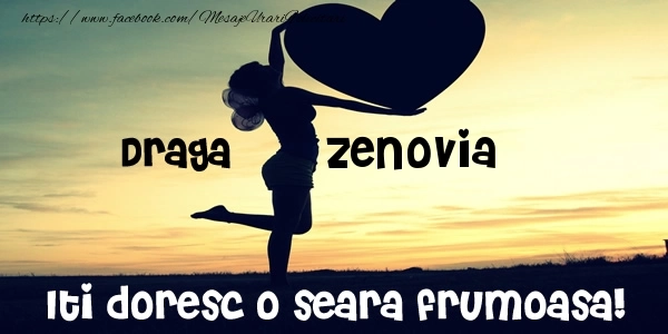 Această felicitare cu o persoană care ține în mână o inimioară la apusul soarelui din colecția noastră de felicitari de buna seara cu numele Zenovia are o notă de originalitate și îți oferă ocazia să faci o persoană să se simtă specială datorită faptului că acolo este numele ei. Felicitarea se poate descărca gratuit sau se poate trimite prin Whatsapp, Facebook, Twitter, Pinterest. Imagine de bună seara cu o persoană care ține în mână o inimioară la apusul soarelui cu dimensiunile 600px x 300px și cu textul Draga Zenovia Iti doresc o seara frumoasa!.