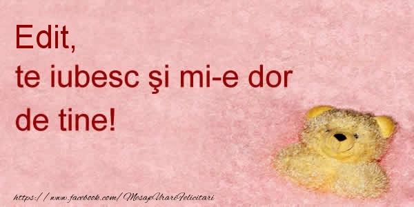 Această felicitare cu ursuleț pentru femei sau bărbați din colecția noastră de felicitari de dragoste cu numele Edit are o notă de originalitate și îți oferă ocazia să faci o persoană să se simtă specială datorită faptului că acolo este numele ei. Felicitarea se poate descărca gratuit sau se poate trimite prin Whatsapp, Facebook, Twitter, Pinterest. Imagine de iubire cu ursuleț pentru femei sau bărbați cu dimensiunile 600px x 300px și cu textul Edit te iubesc si mi-e dor de tine! .