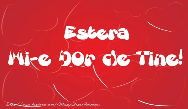 Această felicitare cu fundal cu inimioare din colecția noastră de felicitari de dragoste cu numele Estera are o notă de originalitate și îți oferă ocazia să faci o persoană să se simtă specială datorită faptului că acolo este numele ei. Felicitarea se poate descărca gratuit sau se poate trimite prin Whatsapp, Facebook, Twitter, Pinterest. Imagine de iubire cu fundal cu inimioare cu dimensiunile 600px x 350px și cu textul Estera mi-e dor de tine!.