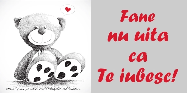 Această felicitare cu un ursulet de dragoste simpatic din colecția noastră de felicitari de dragoste cu numele Fane are o notă de originalitate și îți oferă ocazia să faci o persoană să se simtă specială datorită faptului că acolo este numele ei. Felicitarea se poate descărca gratuit sau se poate trimite prin Whatsapp, Facebook, Twitter, Pinterest. Imagine de iubire cu un ursulet de dragoste simpatic cu dimensiunile 600px x 300px și cu textul Fane nu uita ca Te iubesc!.