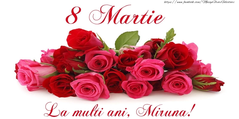 Oferiți mai mult decât un simplu cadou - oferiți o emoție personalizată de Ziua Femeii cu numele Miruna! Felicitarea de 8 Martie cu trandafiri roșii și roz este menită să încânte și să emoționeze, sărbătorind feminitatea în toată splendoarea sa.