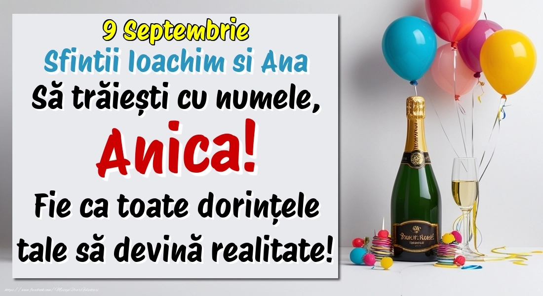 9.Septembrie - Sfintii Ioachim si Ana La mulți ani, Anica! Cu ocazia zilei numelui tău, îți trimit cele mai calde urări de bine și de sănătate! Fie ca tot ce îți dorești să devină realitate.