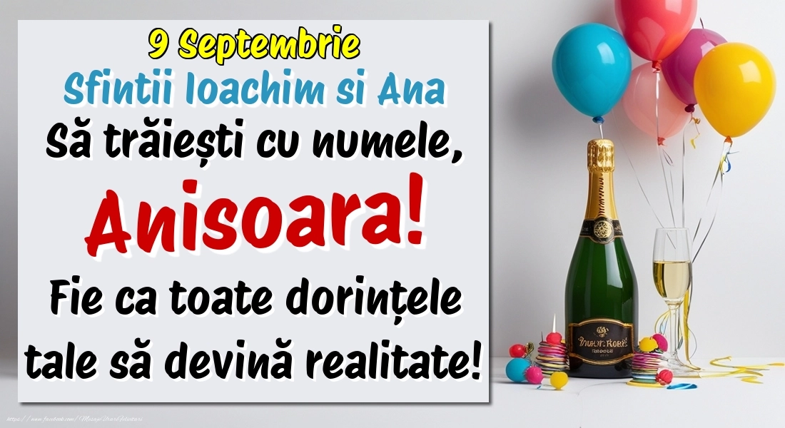 9.Septembrie - Sfintii Ioachim si Ana La mulți ani, Anisoara! Cu ocazia zilei numelui tău, îți trimit cele mai calde urări de bine și de sănătate! Fie ca tot ce îți dorești să devină realitate.