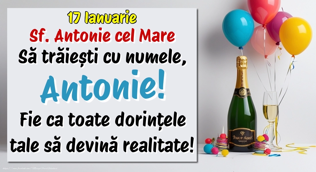 17.Ianuarie - Sf. Antonie cel Mare La mulți ani, Antonie! Cu ocazia zilei numelui tău, îți trimit cele mai calde urări de bine și de sănătate! Fie ca tot ce îți dorești să devină realitate.