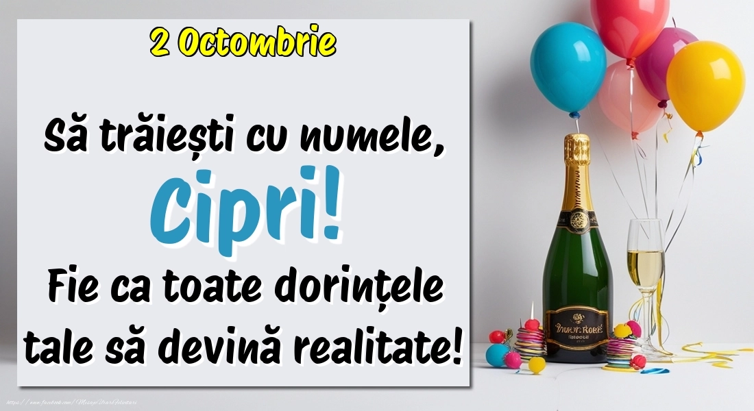 2.Octombrie - La mulți ani, Cipri! Cu ocazia zilei numelui tău, îți trimit cele mai calde urări de bine și de sănătate! Fie ca tot ce îți dorești să devină realitate.