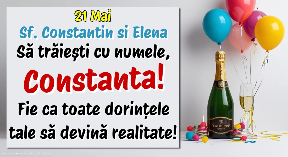 21.Mai - Sf. Constantin si Elena La mulți ani, Constanta! Cu ocazia zilei numelui tău, îți trimit cele mai calde urări de bine și de sănătate! Fie ca tot ce îți dorești să devină realitate.