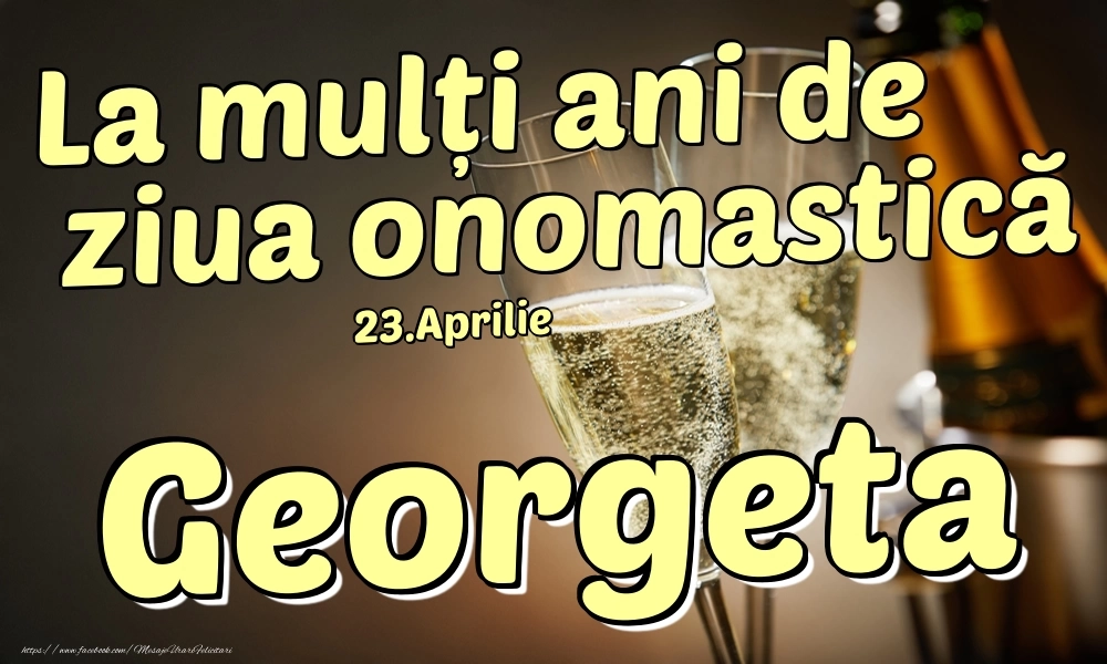 Sărbătorește Ziua Numelui cu imagini personalizate pentru Georgeta (23 Aprilie - Sfântul Gheorghe)! Alege dintre felicitări speciale, pline de culoare și mesaje calde, perfecte pentru a aduce un zâmbet celor dragi. Trimite-le acum o urare unică!